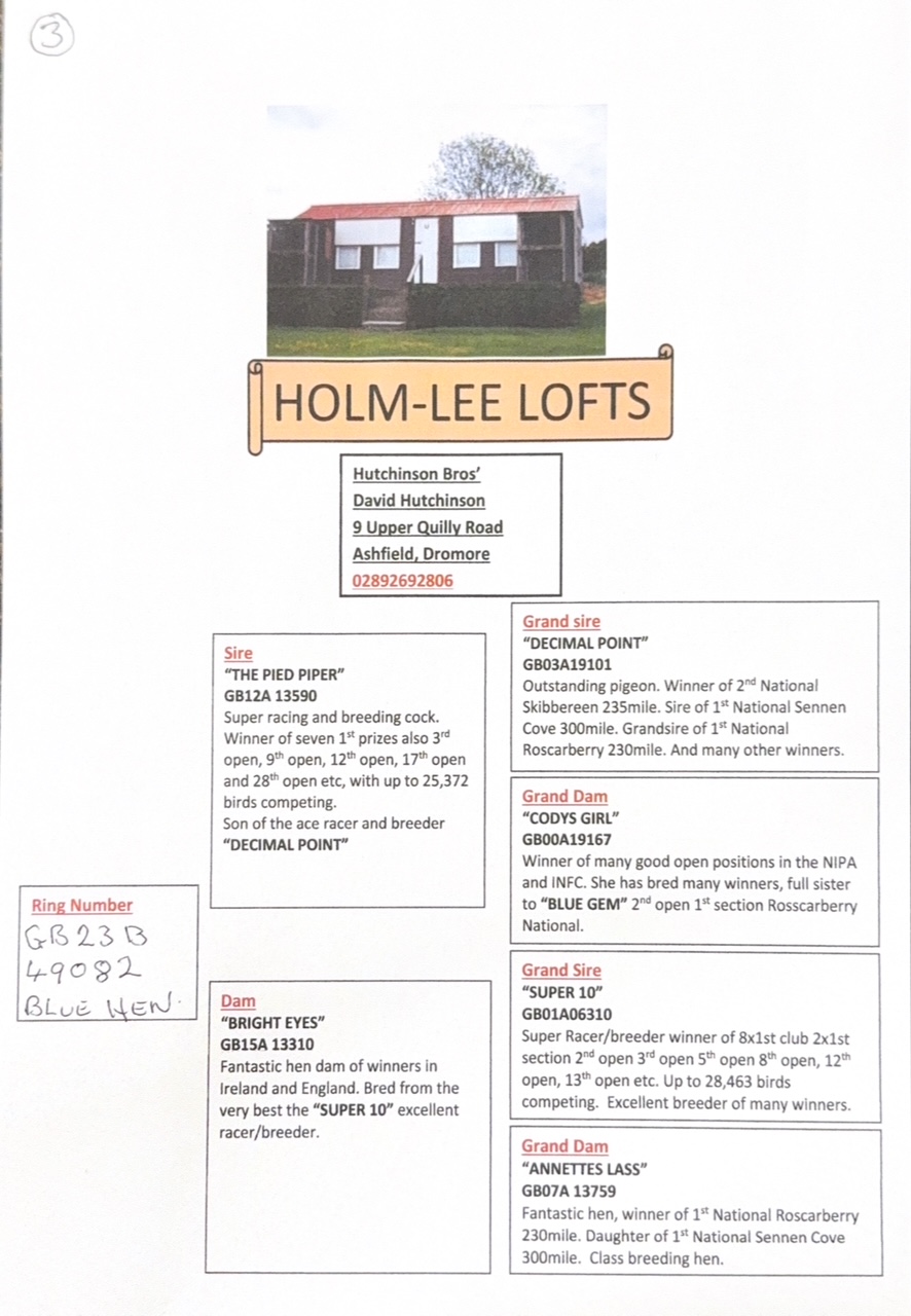 Hutchinson’s loft is known for its top-class racing pigeons, which have achieved national victories. The sale gives other fanciers the opportunity to introduce these successful bloodlines into their own breeding programs.