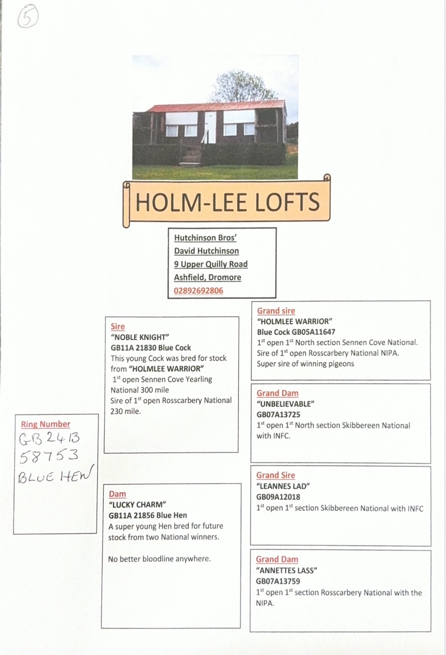 Hutchinson’s loft is known for its top-class racing pigeons, which have achieved national victories. The sale gives other fanciers the opportunity to introduce these successful bloodlines into their own breeding programs.